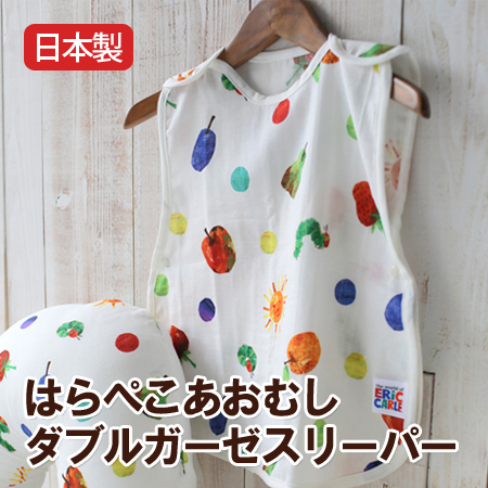 はらぺこあおむしがとっても鮮やかなカラーでプリントされたダブルガーゼ生地を使用した薄手のスリーパーです。夏にふとんをかけても、すぐにはだけてしまう赤ちゃんにぴったりのスリーパーです。ダブルガーゼ生地を使用しているのでふんわりと柔らかく、手触りもバツグンです。