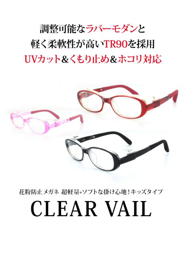 | 【花粉メガネ】クリアヴェール キッズタイプ 超軽量+ソフトな掛け心地 調整可能なラバーモダンと軽く柔軟性のあるTR90を採用! UVカット&くもり止め&ホコリ対応 |