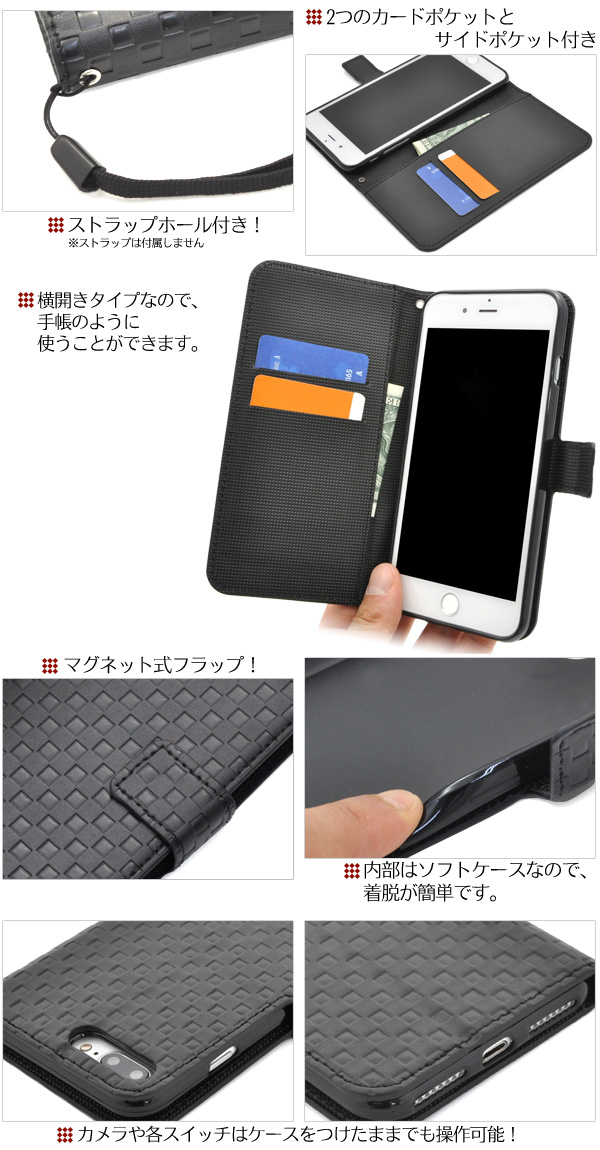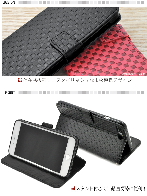 | 市松模様レザーデザインのiPhone8Plus/iPhone7Plus用スタンドケースポーチ。衝撃やキズなどからiPhone 7 Plusを守ります。 また、内部はソフトケースなので着脱が簡単です。背面を折り返すとスタンドとして使用できるので、動画視聴に便利です。落下防止に便利なストラップホール付きです。 横開きタイプなので、手帳のように使うことができます。また、内側に2つのカードポケットとサイドポケットが付いています。 ※iPhone8Plus/iPhone7Plusは付属しません。 ※ライセンス商品ではありません ※カードは付属しません。 | ||||||||||