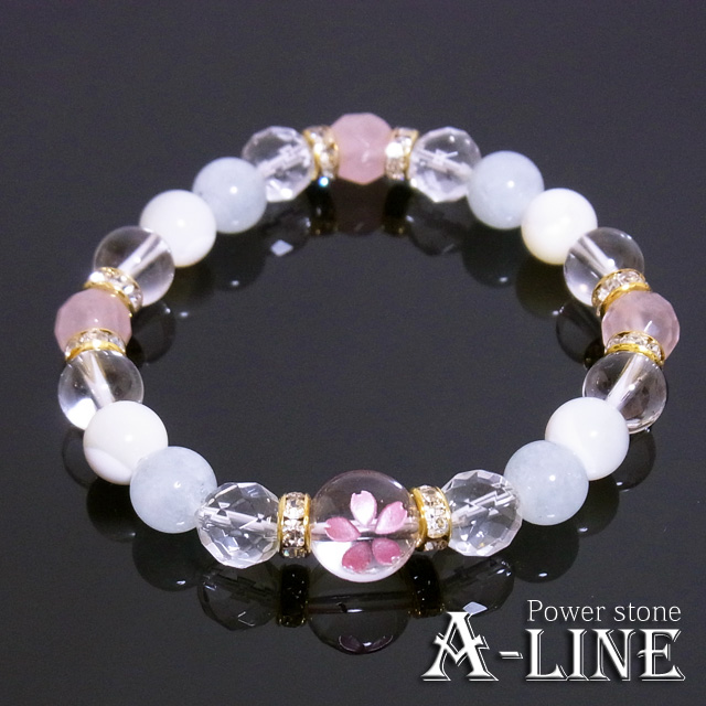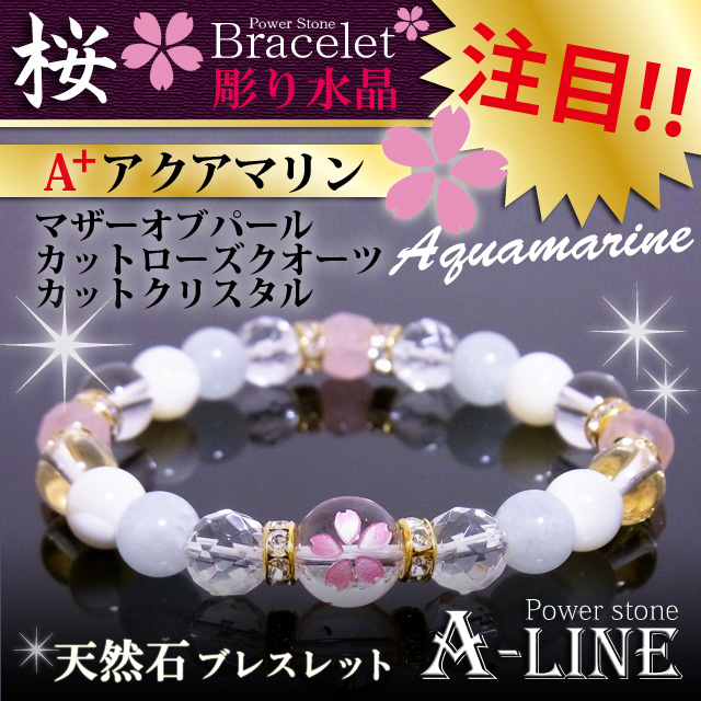 パワーストーン ブレスレット 桜彫り水晶10mm&アクアマリン&マザーオブパール8mm 春限定販売 PW-3078