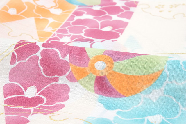 浴衣 レディース bonheur saisons ボヌールセゾン 白系 カラフル 橙色 赤 水色 緑 雪輪 椿 紙風船 ラメ 綿 紅梅織り 夏祭り 花火大会 女性用 仕立て上がり 【フリーサイズ】
