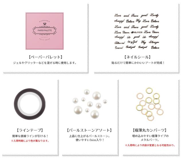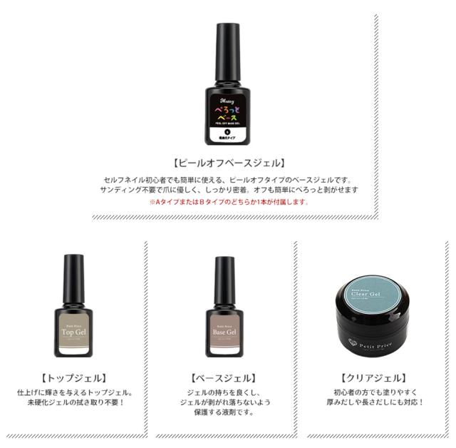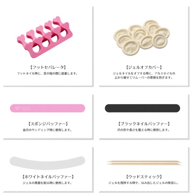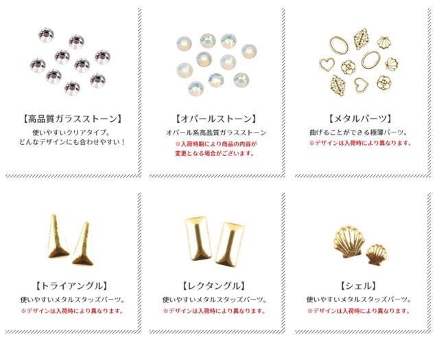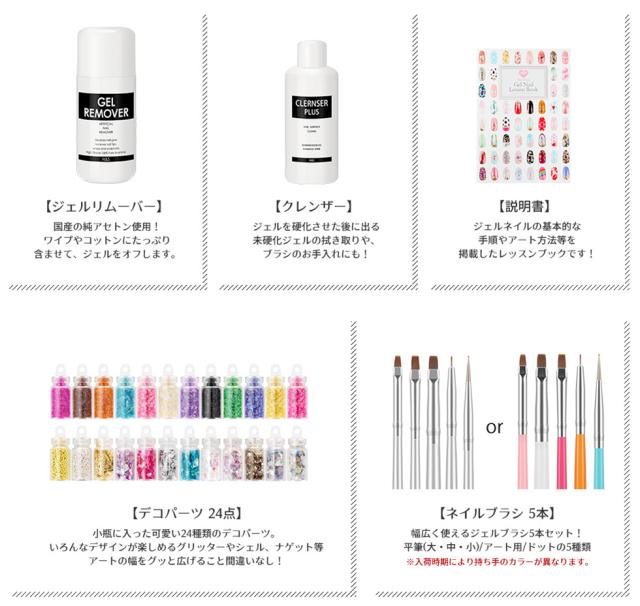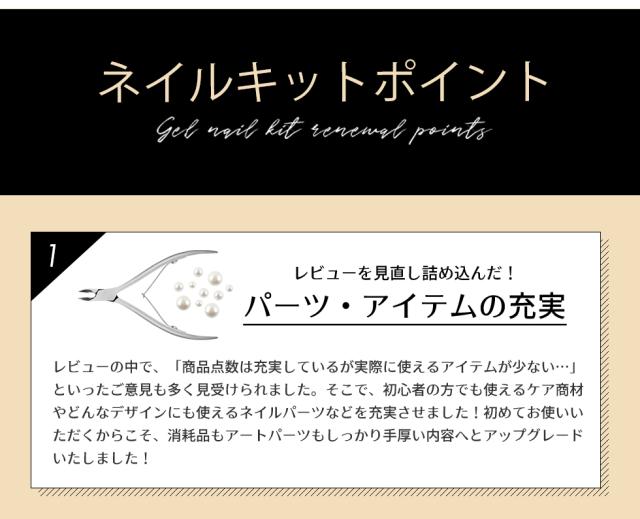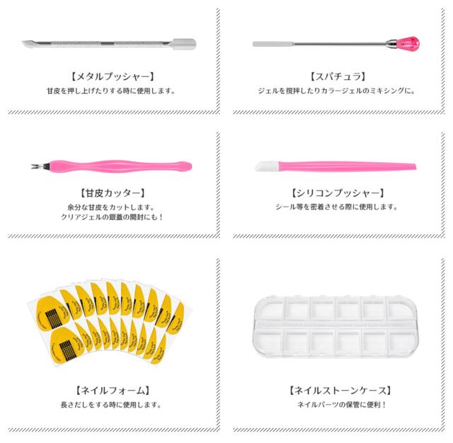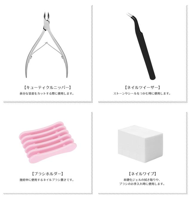 | 内容量 | プチプラカラージェル3g×10 クリアジェル/トップジェル/ベースジェル/ピールオフベースジェル クレンザープラス/ジェルリムーバー キューティクルニッパー/ツイーザー ネイルワイプ/ジェルブラシ/ブラシスタンド/ネイルワイプ スポンジバッファー/ブラックネイルバッファー/ホワイトネイルバッファー/ウッドスティック メタルプッシャー/スパチュラ/シリコンプッシャー/甘皮カッター/ネイルフォーム/ストーンケース/ペーパーパレット/ネイルシール/ラインテープ パールストーンアソート/丸カンパーツ/ガラスストーン/オパールストーン/メタルパーツ/メタルスタッズ3種 |
