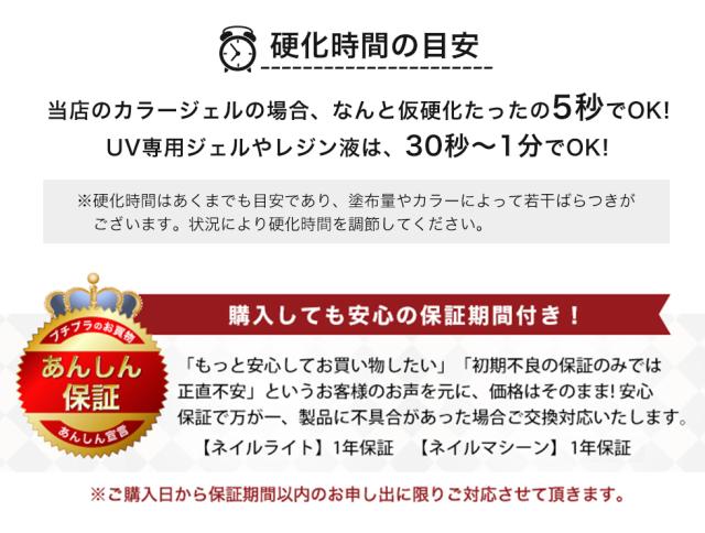| 注意事項 | 【注文時の注意事項】 ※ご希望のカラージェル10色をご選択いただいているか確認をお願いします。 万が一、10色以上ご選択の場合は、若い番号より10色をご準備させていただきます。 また10色以下、もしくは未選択の場合は、当店にてカラーを選択させていただきます。 同色をご希望の際は、仮のカラーを10色ご選択いただきまして、 備考欄にご希望のカラー番号とカラー名をご記載ください。 ・販売中にやむを得ず、カラージェルの欠品が生じる場合がございます。 大変ご迷惑をお掛けいたしますが、その際は当店よりご連絡致します。 ・また、発送準備中のカラー変更に関しまして、状況により対応できない可能性がございます。 予めご了承くださいませ。 ・ライトは輸入品の為、箱つぶれ、多少の傷、汚れなどが付着している場合がございます。 また、入荷時期によってロゴの印字デザインが異なる場合がございます。 その点ご理解頂きますようお願い致します。 【到着時確認事項】 ・お手元に届きましたら、ライトの動作確認をお願いします。 万が一、不良がございましたら交換いたしますので 到着後、早急にご連絡をお願い致します。 ▼保証期限▼ (ネイルライト:1年保証) 【ジェル使用上の注意事項】 ・ジェルには独特の匂いがあります。十分に換気をしながらご使用ください。 ・カラージェルをご使用前は必ず撹拌してお使いください ・カラーの色味によって、顔料の量やラメ、グリッターの量に違いがあるため、 開封時に見た目の内容量の差が感じられる場合がございます。 内容量はすべて3gとなりますので、ご安心ください。 ・カラージェルの色味は、ご覧になるモニターにより実物と色味が若干異なる場合がございます。 ・クリアジェル、カラージェルをご使用後は、ボトルの周りに付いたジェルを綺麗にふき取って 直射日光を避け、冷所で水平に保管してください。 ・入荷時期により、ラベルシールのお色味が異なる場合がございます。 ・ラベルシールの印刷のずれや、手作業でラベルシールを貼り付けているため、 貼り付け位置にずれが生じる場合がございます。予めご了承くださいませ。 |