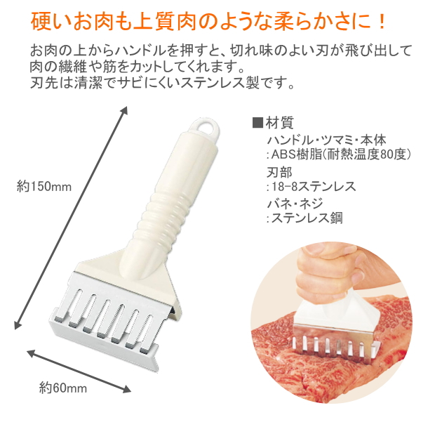 | 特徴 | 硬いお肉も上質肉のような柔らかさに。 お肉の上でからハンドルを押すと、切れ味のよい刃が飛び出して肉の繊維や筋をカットしてくれます。 刃先は清潔でサビにくいステンレス製です。 |