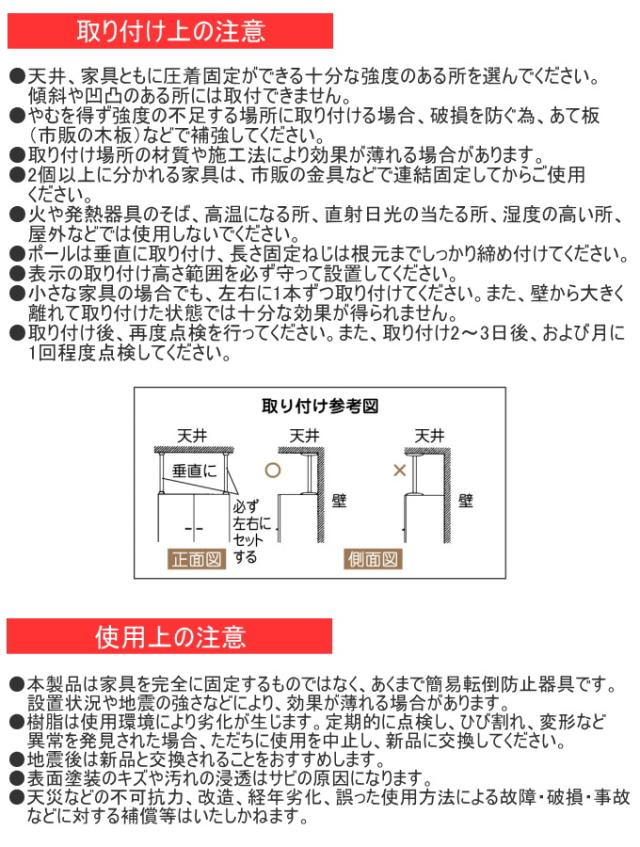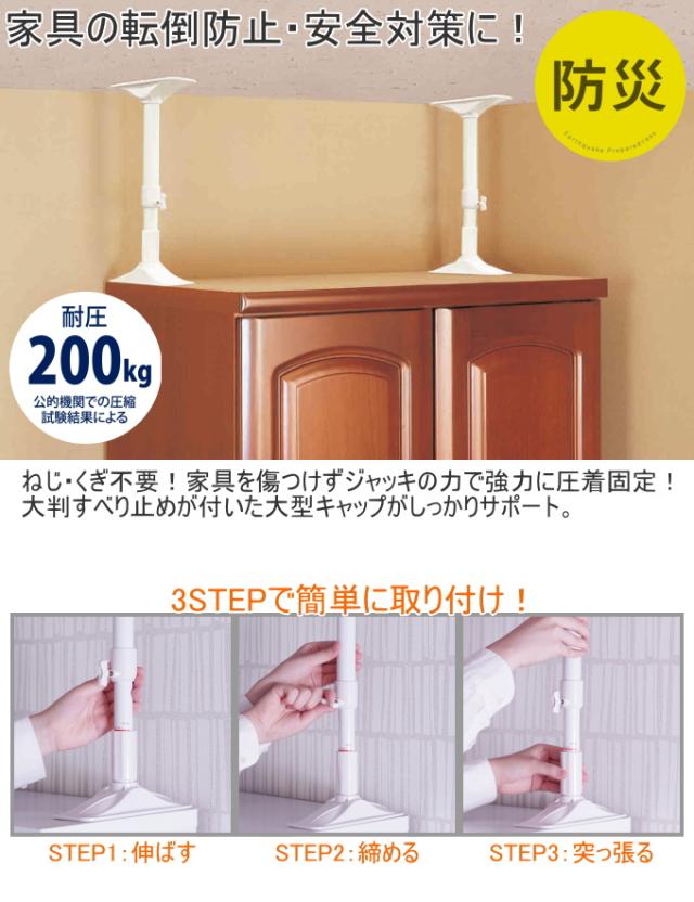 急な地震などによる転倒、ズレ防止に最適! 耐圧は200kg ジャッキの力で強力に圧着固定。 大判すべり止めがしっかりサポート。 ※ポールは2本入っています。 |