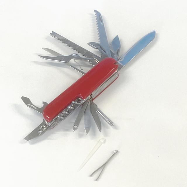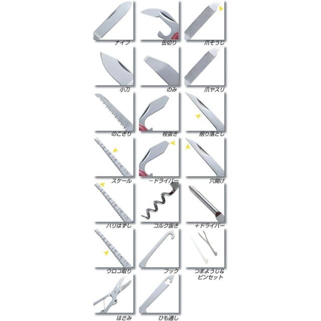 ナイフ、缶切り、小刀、爪ヤスリ、ノコギリ、栓抜き、マイナスドライバー、穴開け、コルク抜、き、プラスドライバー、ハサミ、ひも通し、爪楊枝&ピンセット等が使えます。