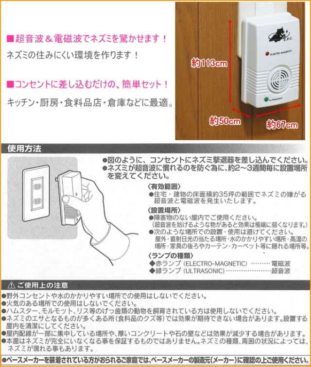 コンセントに差し込むだけで、ネズミのいらがる超音波と電磁波を発信し、ネズミのすみにくい環境を作ります。