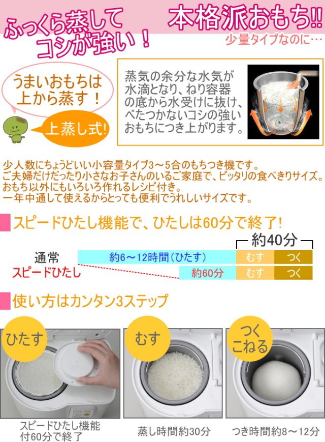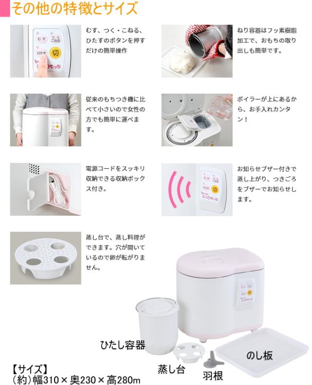- 使い勝手もよく、とても良い物を買ったと思いました。 説明書通り固めに蒸しあがるので、柔らかめの場合は浸す時間を長くしたり、こねの際にお水を入れたりとすればとても良いお餅ができますよ。