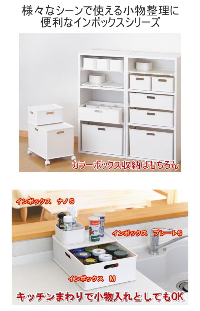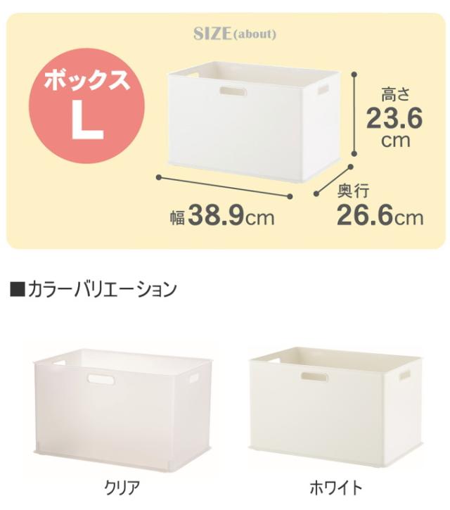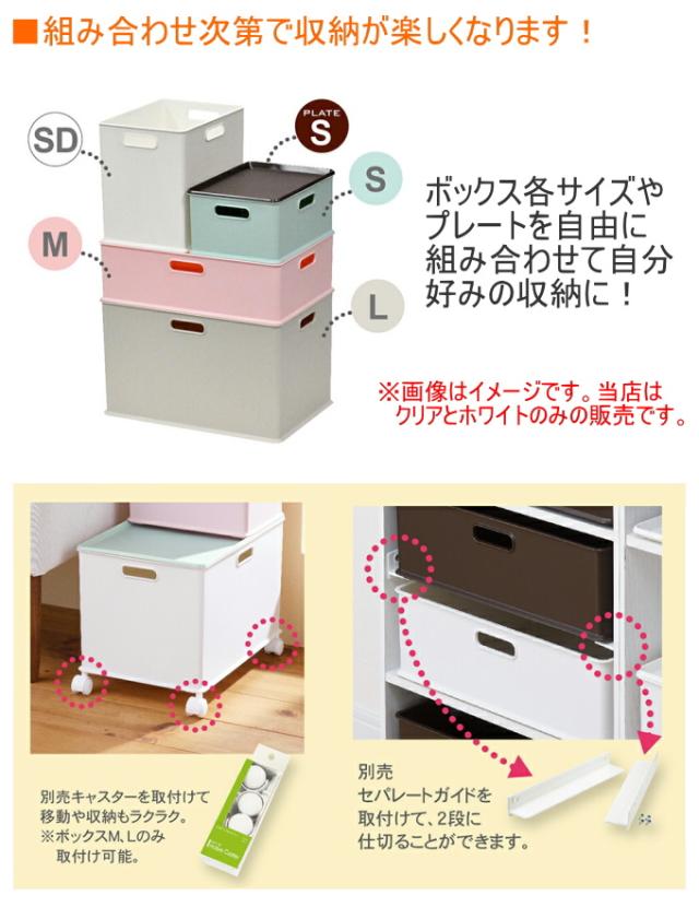 小物等の収納にとっても便利。 カラーボックスをきれいに整理できます。 シリーズ品で積み重ねが可能だから好みに合わせて積み重ねできます。 キッチン、リビング等幅広いシーンで使えます。 別売のアクティブキャスターが使用できます。(ボックスM、Lのみ取り付け可能) 別売のセパレートガイドを取り付けて2段に仕切ることができます。 クリア、ホワイトの2色からお選びください。 ※必ずご使用のカラーボックスの内寸をご確認ください。 |