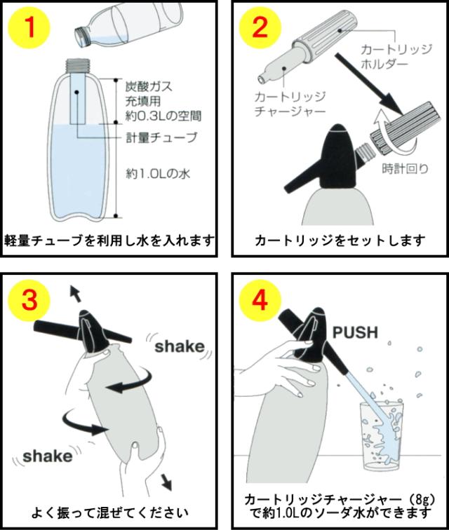 炭酸ガスを充填し、説明書通りにソーダサイフォンを振った後、冷蔵庫で30分くらい冷やしてください。 炭酸ガスが水によく溶けより美味しくなります。