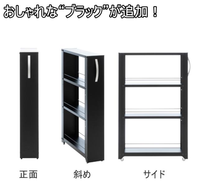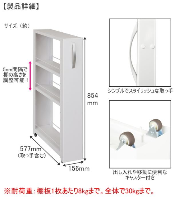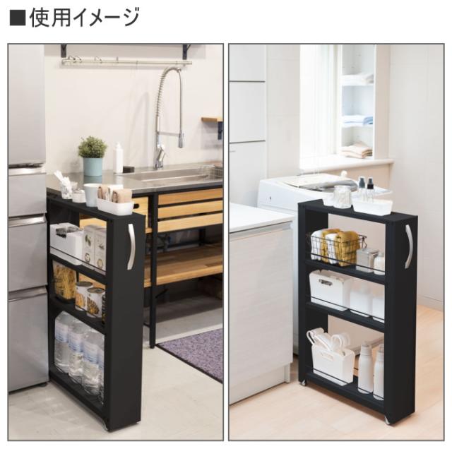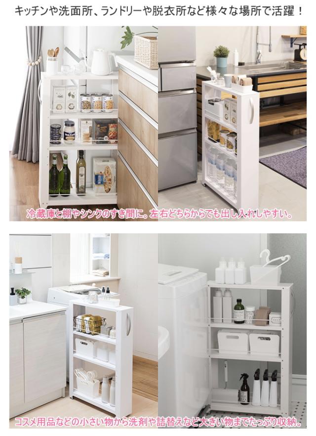 | 特徴 | キッチンやサニタリーのすき間に便利なワゴン。 両サイドがオープンなので取り出しやすく置きやすい。 スリムなのに大容量の収納が可能。 取っ手とキャスター付きで出し入れが簡単。 可動棚は5cm間隔で調節可能なのでお好きに調整できます。 清潔感があり、上品なマット調塗装。 ホワイト・ブラックの2色からお選びください。 ※転倒防止チェーンは必ず使用して下さい。取付けない場合はお客様の責任においてご使用ください。 ※使用場所のサイズなど必ず確認して下さい。 |
