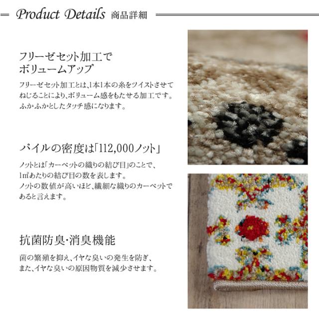 ■ ウィルトン織りの玄関マットです。 ■ ウィルトン織りは非常に耐久性の高い織物です。 家の中でも靴を履いて生活するヨーロッパで、土足で扱うことを前提として作られておりますので、長時間踏みつけてもヘタリにくく、弾力性もあり長くご使用頂けます。 ■ 本商品の『繊維の密度を表すノット数』は112,000ノットです。 ■ 本商品のパイル部分にはポリプロピレン素材を使用しております。 ポリプロピレンはヘタリにくく、耐久性に優れ、繊維の中でも軽い素材です。 また、汚れが付着しにくく、遊び毛や毛玉が非常に出にくいという特徴もあります。 ■ 玄関のワンポイントとして、ご使用していただきますと華やかになり高級感がでます。 ■ 抗菌・防臭、消臭機能がついていますので、臭いが気になる玄関でも安心してお使いいただけます。 ※ 掲載写真は表記サイズと異なる場合がございます。 ※ 画面上のカラーはご使用ブラウザやモニターの設定により、実物とは若干異なる場合がございます。あらかじめご了承の上、ご注文をお願いいたします。 | |