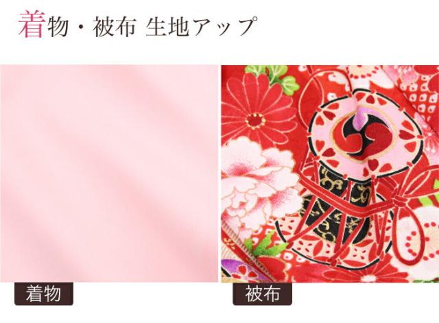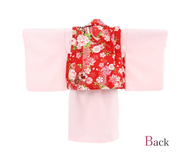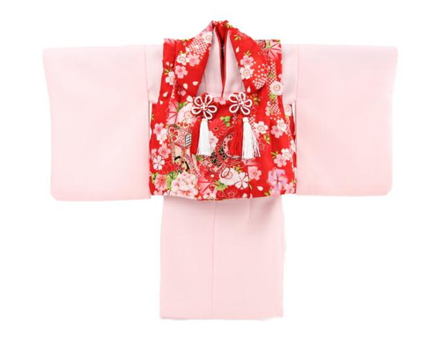 レンタル 女の子 1歳用着物レンタル「ピンク無地着物に赤被布(御所車と鼓)」