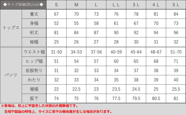 | 特徴 | ▼トップス ・袖裾リブ ・胴裾ストレート ・両サイドポケット ▼パンツ ・ウエストゴム(縛り紐あり) ・裾ストレート ・両サイドポケット |