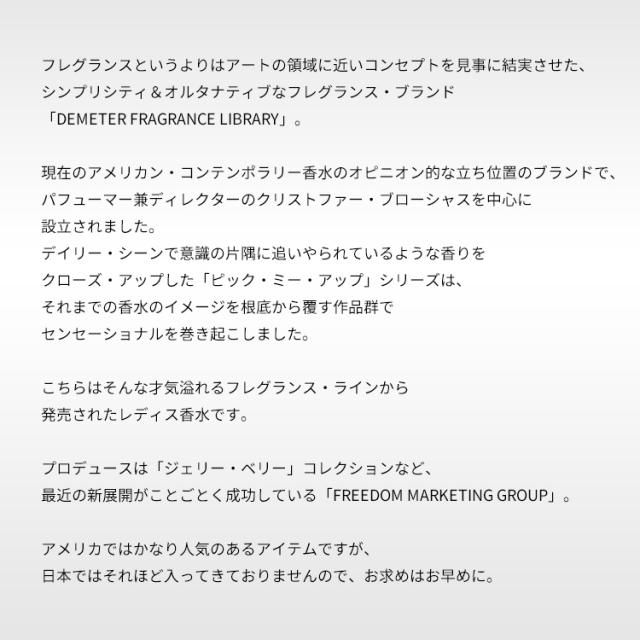 フレグランスというよりはアートの領域に近いコンセプトを見事に結実させた、シンプリシティ&オルタナティブなフレグランス・ブランド「DEMETER FRAGRANCE LIBRARY」。現在のアメリカン・コンテンポラリー香水のオピニオン的な立ち位置のブランドで、パフューマー兼ディレクターのクリストファー・ブローシャスを中心に設立されました。デイリー・シーンで意識の片隅に追いやられているような香りをクローズ・アップした「ピック・ミー・アップ」シリーズは、それまでの香水のイメージを根底から覆す作品群でセンセーショナルを巻き起こしました。