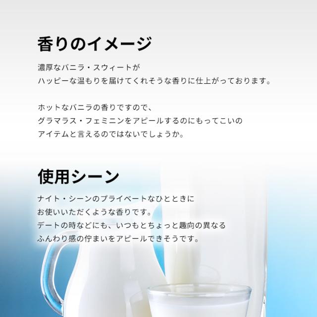 ということで、れん乳は主にアイスクリームの原料として用いられますが、こちらの甘〜いれん乳の香りもまさにバニラ・アイスクリーム。濃厚なバニラ・スウィートがハッピーな温もりを届けてくれそうな香りに仕上がっております。