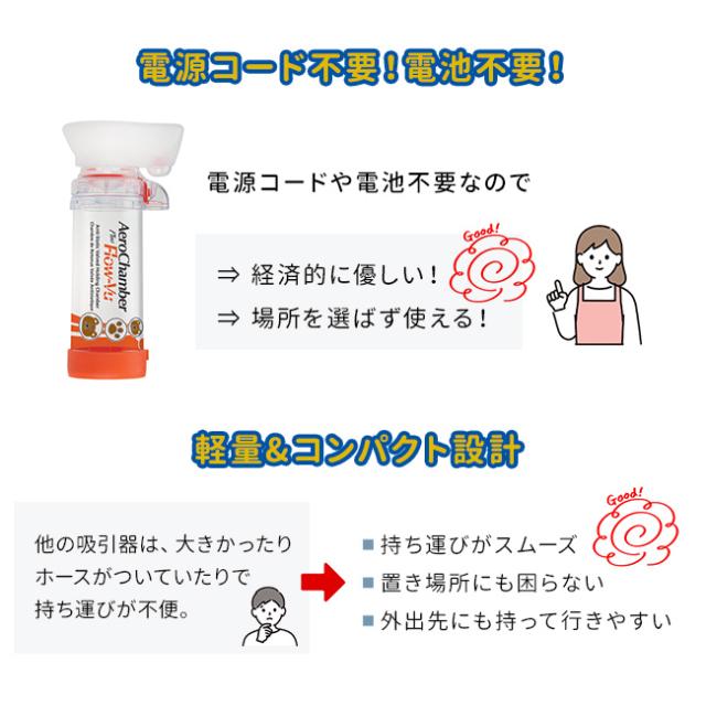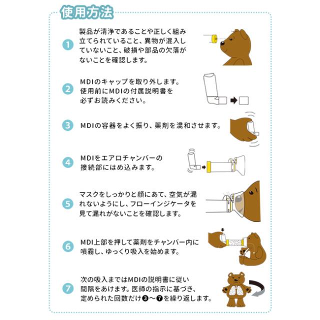 | 使用方法 | 【マウスピースタイプ(大人用/キッズ用)】 大人用・キッズ用はカラー(デザイン)が違うだけで、仕様は同じです。 薬剤噴霧後、ゆっくり呼吸してから10秒ほど息を止め、マウスピースから口を外してゆっくり息を吐いて下さい。1回で吸入できない場合は、2〜3回に分けて吸入します。 フローホイッスルが鳴る場合は、吸入の速度が速すぎますので、ゆっくり吸うようにして下さい。 |