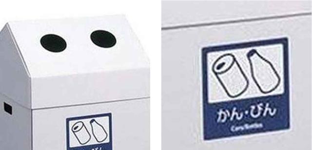 | フタ付き 丸穴が開いていることで、缶・ビン専用と認識しやすく誤投入を防ぎます。 | 分別シール付き ひと目で分別ができます。日本語と英語の2ヵ国語表記です。 |