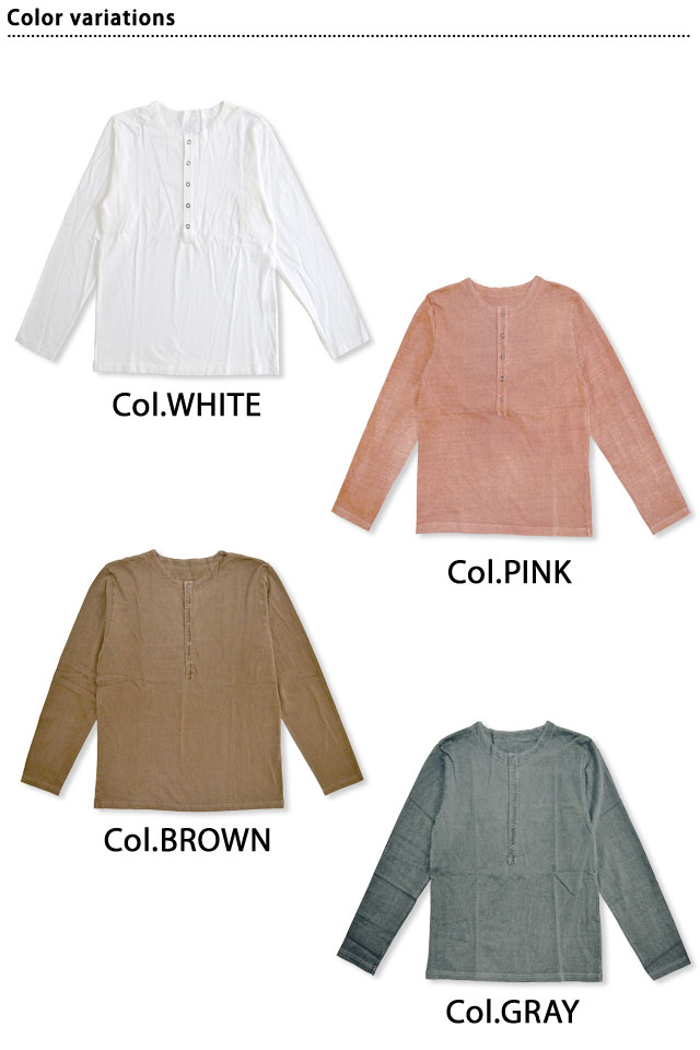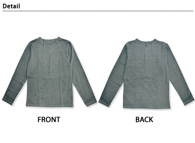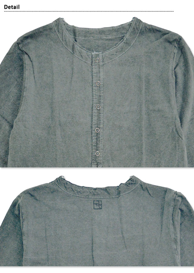 手描き・手抜染め・藍染めなどを扱い、手のぬくもりを伝えるお洋服を追求し続けるパラスパレスから、「ヘンリーネック長袖Tシャツ(PCT-3197D)」のご紹介です! くたっとした柔らかで薄手な肌触りが魅力的な、コットン生地の長袖Tシャツです。 また、襟元には切りっぱなし風の加工が施されています。 シンプルなデザインですので、柄物のお洋服にも相性抜群。 染色の性質上、洗濯や摩擦により色が落ちることがありますので、他のものと分けて洗って下さい。 | ||||||||||||||||||||