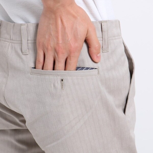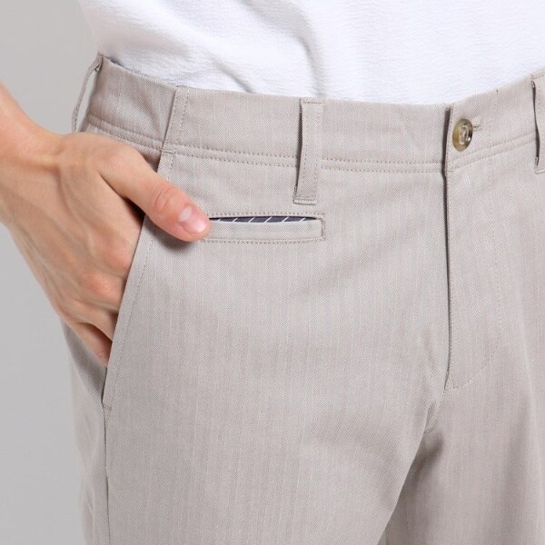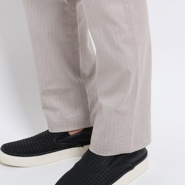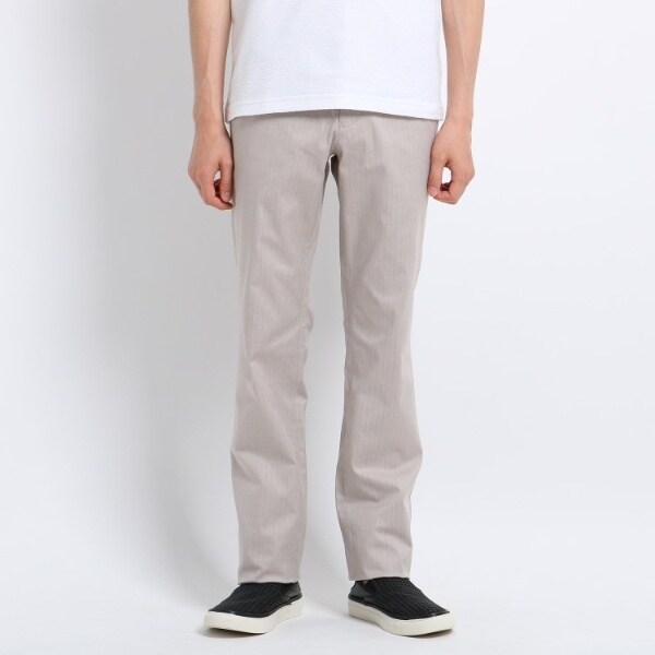 コットンをベースにストレッチ性を加えた履き心地の良いストレートパンツ。遠目には無地っぽく見えますがシャドーで入れたヘリンボンストライプが程よい光沢感をだし、上品な仕上がりとなっています。また、細めのシルエットがきれい目な大人の印象を与えてくれます。
