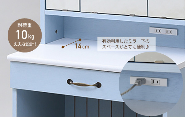 広い天板が使いやすい!ミラー下にも小物を置けるスペースがあり、ゆったり広々とした天板で毎日のメイクやセットも快適に。また2口コンセントが付いているのでドライヤーやヘアアイロンなども使用できます。(合計1500W)