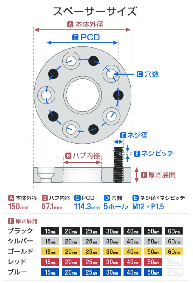 | 注意事項 | ・純正スタッドボルトにワイドトレッドスペーサーを取り付けたとき、スタッドがスペーサーより突出してなおかつ取り付けホイールに逃げがない場合は取り付けできません。 ・装着ホイールの裏側に「逃げ」のある場合は、ワイドトレッドスペーサーを取り付け可能ですが、「逃げ」の深さが純正スタッドボルトを十分に逃がす深さがない場合は、取り付けできません。 ・ワイドトレッドスペーサーを装着後は、タイヤの偏摩耗を防ぐためアライメント調整をオススメします。 ・スライドドアの車両に取り付ける場合、タイヤのはみ出しにご注意ください。スライドドアがタイヤに干渉する場合があります。 ・取り付け、取り扱い上の誤り、または不当な改造を施している車両に取り付けた場合の故障及び破損については一切保証いたしません。 |