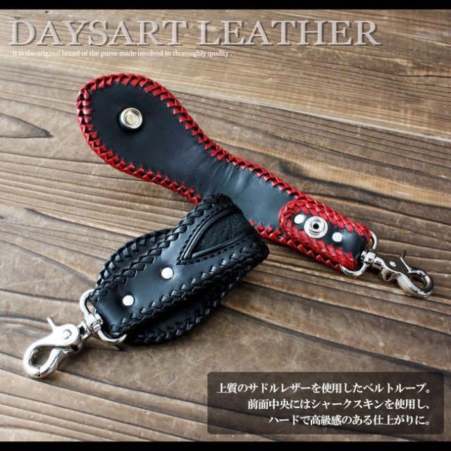 良質なサドルレザーをベースにアクセントにサメ革を使用した上品さとワイルドさを兼ね備えたデイズアートオリジナルのベルトループキーホルダーです。くり貫かれた内側は折り返して縫い合わせており、外側はレースアップを全体に施してあります。デザイン性と耐久性を兼ね備える手間と高い技術を惜しまない作りとなっています。アクセントにはデイズアートコンチョを使用し、ホワイトメタルの輝きとスマートなデザインが高級感のある雰囲気に仕立てています。