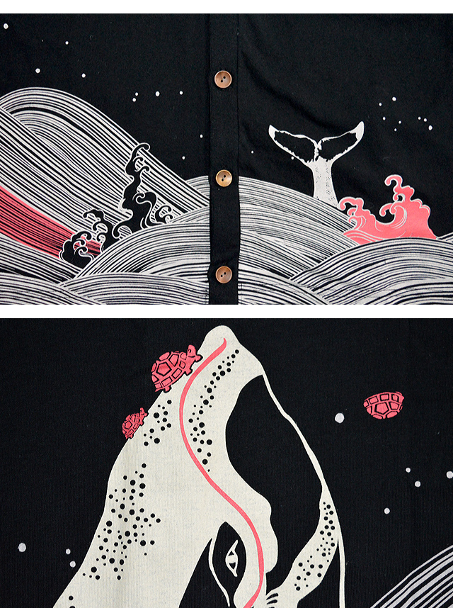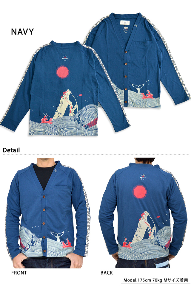 着た人、それを見た人が笑顔になれる、他にはないデザインを提供し続けている「喜人」さんから、 荒波にもまれる鯨とその鯨に必死にしがみ付く亀さんの親子を描いたほっこりする一枚。 荒波の中を泳ぐ、躍動感抜群の鯨の姿をカーディガンに落とし込みました。 フロントには尾びれ、バックには鯨の頭が突き出す様子をデザイン。 海の上には、真っ赤な太陽をプリントし、アクセントにしました。 フロントはボタン仕様。 ボディーには、綿100%のTシャツ生地を採用しており、 | ||||||||||||||||||||||||