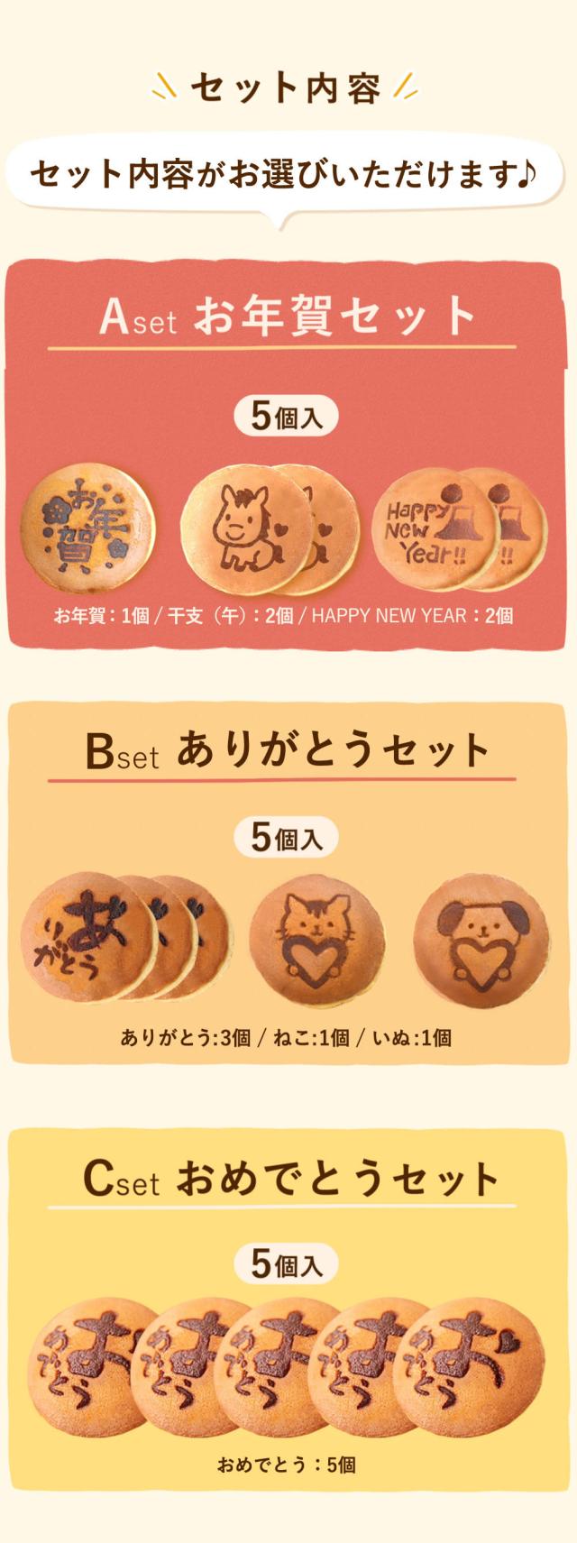 ■Aset(お年賀セット) 絵柄:お年賀(1個)、干支・午(2個)、HAPPY NEW YEAR(2個) ■Bset(ありがとうセット) 絵柄:ありがとう(3個)、猫(1個)、犬(1個) ■Cset(おめでとうセット) 絵柄:おめでとう(5個) 【お芋どら焼き 5個】 賞味期限:発送から常温で約20日 ※直射日光を避け、保存してください。 芋入り餡(砂糖、小豆、さつまいも、還元水飴、水あめ、寒天、食塩)、卵、小麦粉、砂糖、黒糖、植物油脂、はちみつ、水あめ、みりん、麦芽糖、寒天/トレハロース、クロレラ抽出物、膨張剤、乳化剤、香料 【発送の温度帯】 常温便にてお届け |