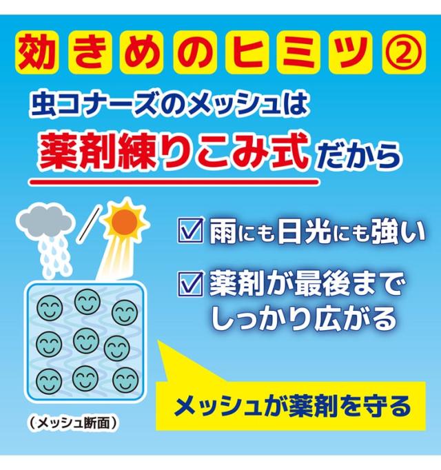 ●メッシュの中に薬剤が練り込んであり、約250日間効果を発揮、屋内へのイヤな虫の侵入を防ぐためにご使用ください。