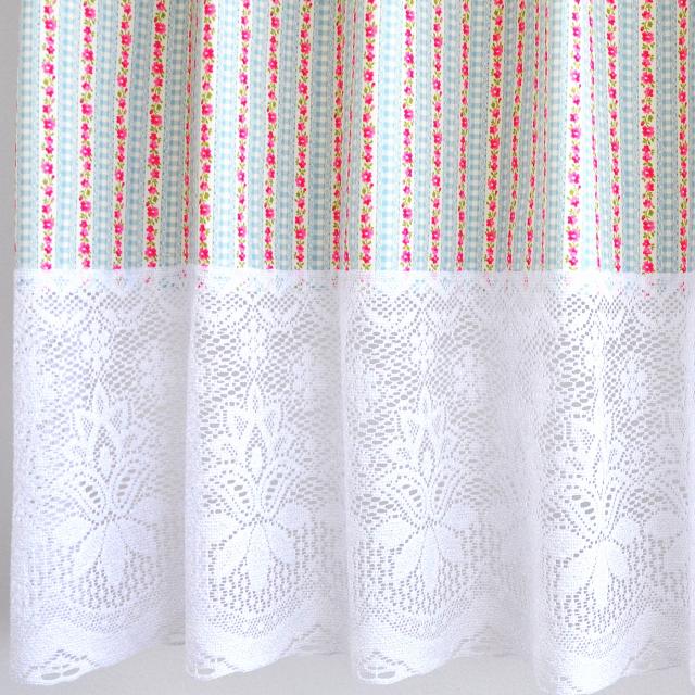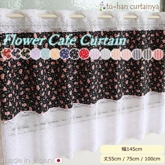 【日本製】【花柄 カフェカーテン】レース飾り 小窓用 おしゃれ 可愛い ケミカルレース 間仕切り コットン綿100% 簡単取付 突っ張り棒カーテン キッチン 春 幅145cm 丈55cm 丈75cm 丈100cm