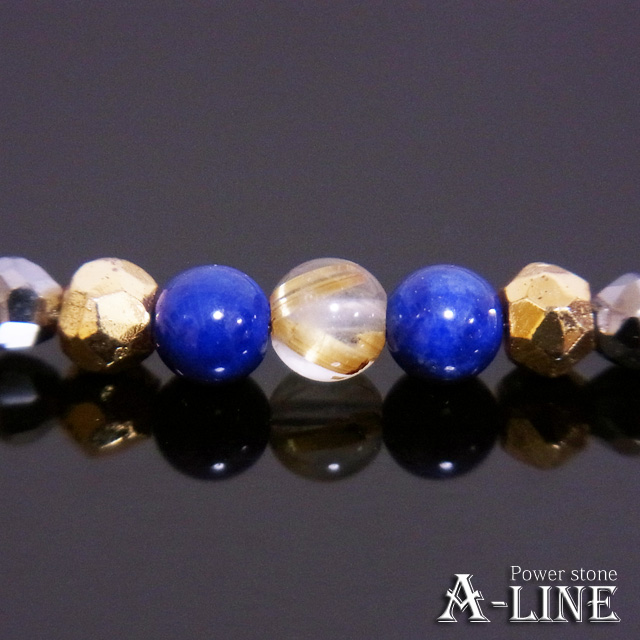 トップにAAAラピスラズリで挟んだ3mmのルチルクォーツも使用し、パイライトで挟んだ豪華な逸品!