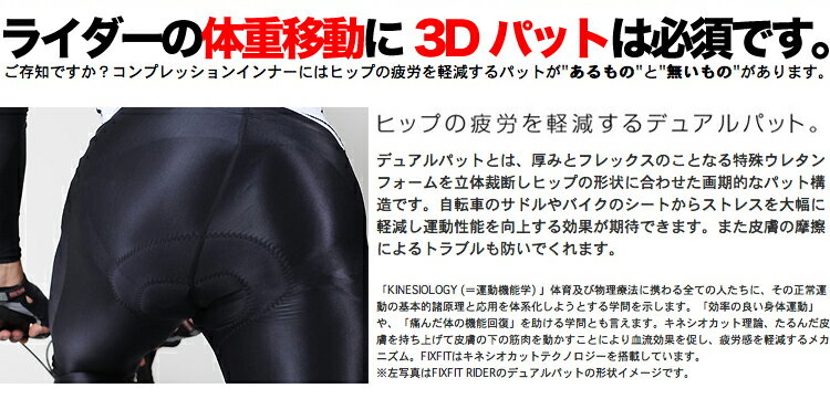 安いインナーは筋肉疲労を回復する"コンプレッション"加圧機能がついていないものがほとんどです。これからのインナーに求められるのは筋肉を効率よくサポートするキネシオカット搭載のコンプレッションインナーです。FIXFITは大腿四頭筋、薄筋、大腿筋膜張筋、前脛骨筋、L4-5、中殿筋を効率よくサポートして筋肉疲労を軽減・回復します。