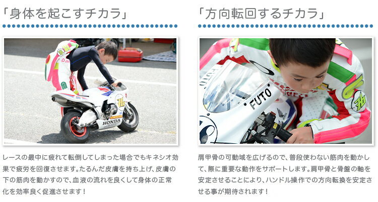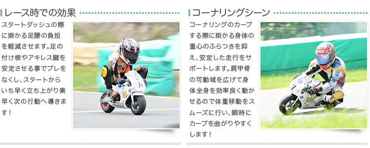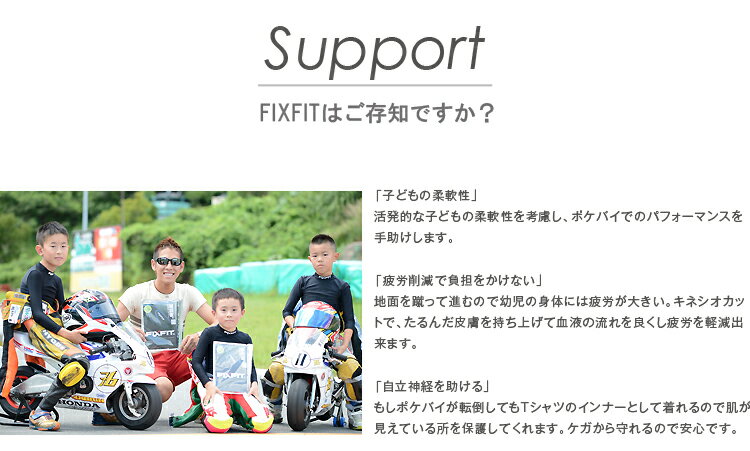 "FIXFIT JUNIOR" はそんなポケバイを乗りこなし、コーナリング・立ち上がりでの体重移動やブレーキング、ストレートでのスピードでライバルに差をつけたい小さなライダー達に幅広く対応します。
