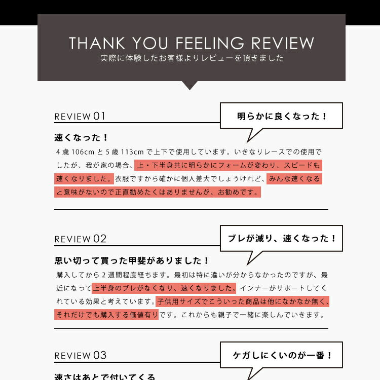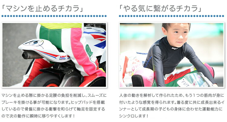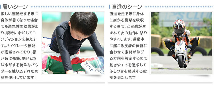 万が一、コースでの事故があった場合にレーシングスーツやツナギの中にインナーとして装備していれば、ヘルメットとプロテクター、グローブと合わせて肌への外傷を軽減し、子供の身体を守ります。