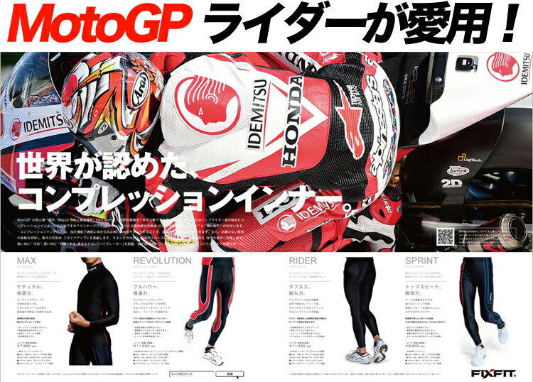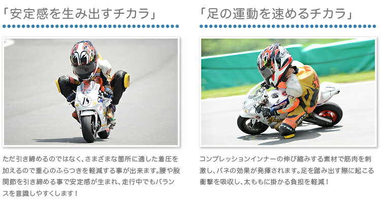 世界選手権GPレーサーや全日本ロードレーサー達が認める勝利のためのコンプレッションインナー。ご存知ですか?インナーパンツ・アンダーシャツには筋肉疲労を軽減・回復する機能が"あるもの"と"無いもの"が存在します。"コンプレッションインナー"は、加圧機能で適度に体を包み込み、筋肉をサポートすることで、運動機能の向上が期待できます。また、必要のない筋肉の振動を抑制し、集中力を高め、スタミナアップにも貢献します。キネシオカットは、血流がスムーズになることで、むくみを抑え、疲労を素早く回復します。熱い時に"冷却"、寒い時に"発熱"する、着るエアコン「ハイグレーター」を搭載。吸汗速乾はあたりまえ、抗菌・消臭機能、phコントロールで快適サポート。