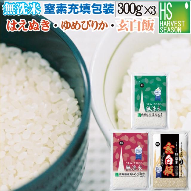 無洗米 食べ比べセット 令和7年産 山形はえぬき + 北海道ゆめぴりか +玄白飯 各300g(2合)(計900g)【メール便送料無料】【鮮度を保つ窒素充填】