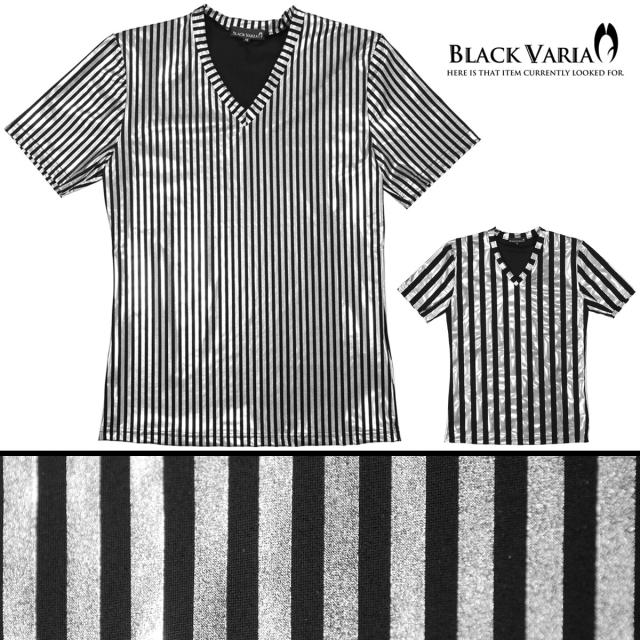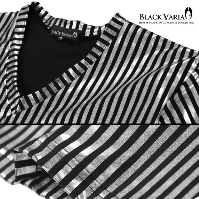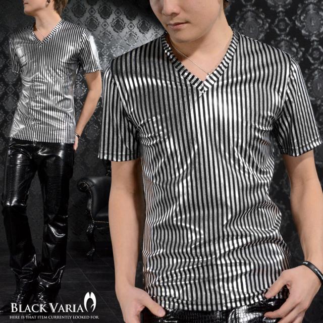 メール便可/一枚まで Tシャツ 半袖 ロンドンストライプ シルバー箔 光沢 Vネック メンズ 日本製 細身(細シルバー銀ブラック黒) 163919