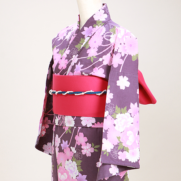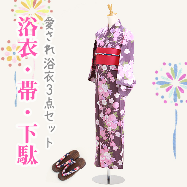 浴衣 レンタル NT-y054 浴衣3点セット☆浴衣・帯・下駄☆紫色/ピンク花 送料無料