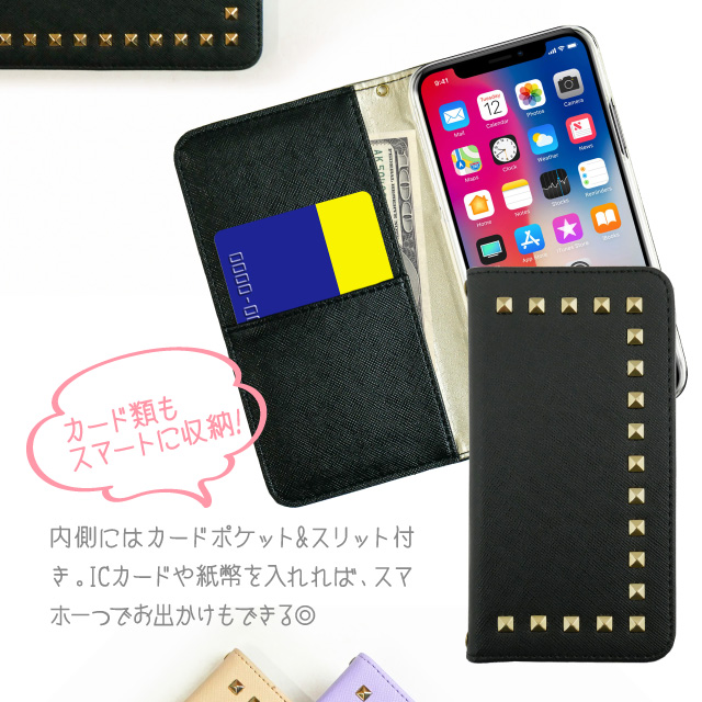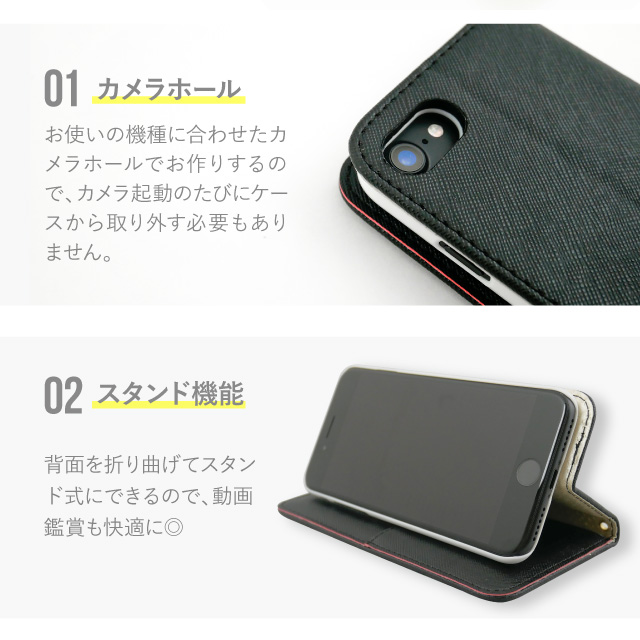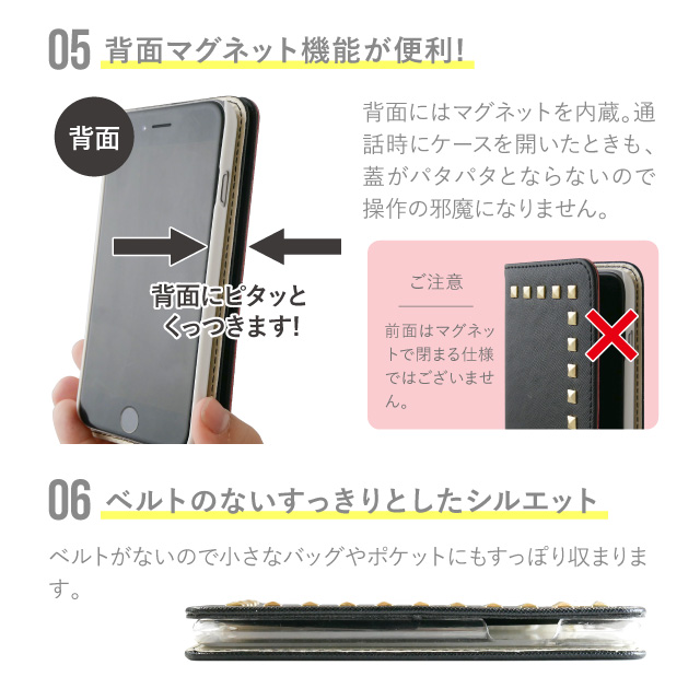 | 機能 | ・両面カバーで、スマートフォンの液晶も本体もしっかり両面保護 ・ポケットの中やバッグの中での誤操作を防止 ・マグネット内蔵(背面のみマグネットで固定できます) ・カードスロット×1・ポケット×1 ・ストラップホール×2 ・装着したままカメラ機能が使えます ・装着したまま充電可能(卓上不可) |