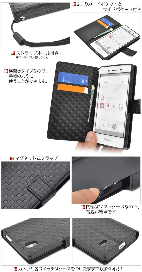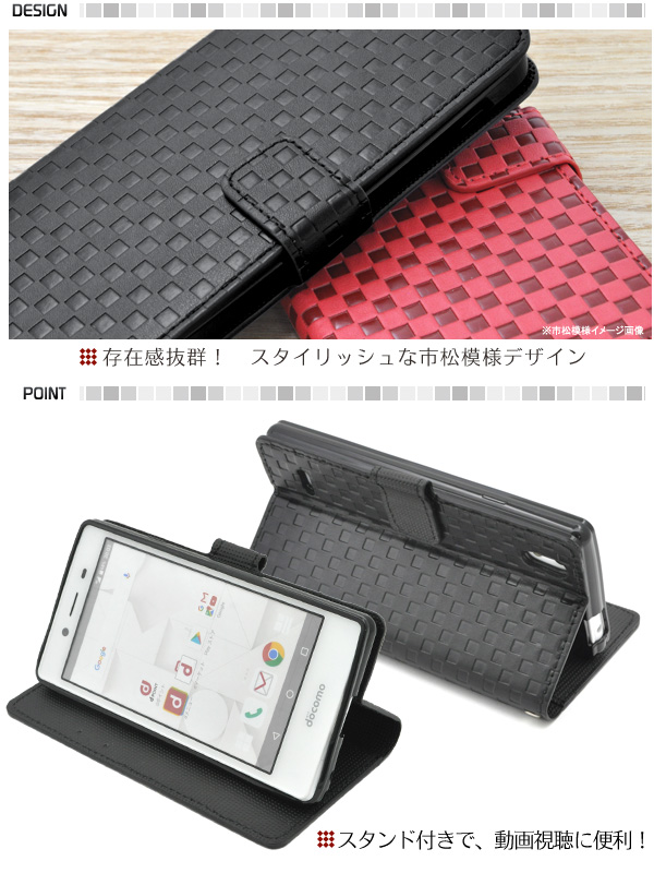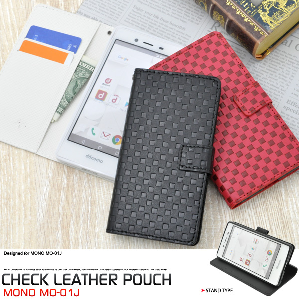使いやすい手帳型ケース!MONO MO-01J用市松模様デザインスタンドケースポーチ