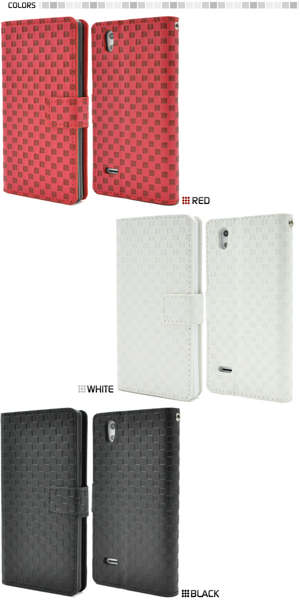 市松模様レザーデザインのMONO MO-01J用スタンドケースポーチ。 衝撃やキズなどからMONO MO-01Jを守ります。また、内部はソフトケースなので着脱が簡単です。