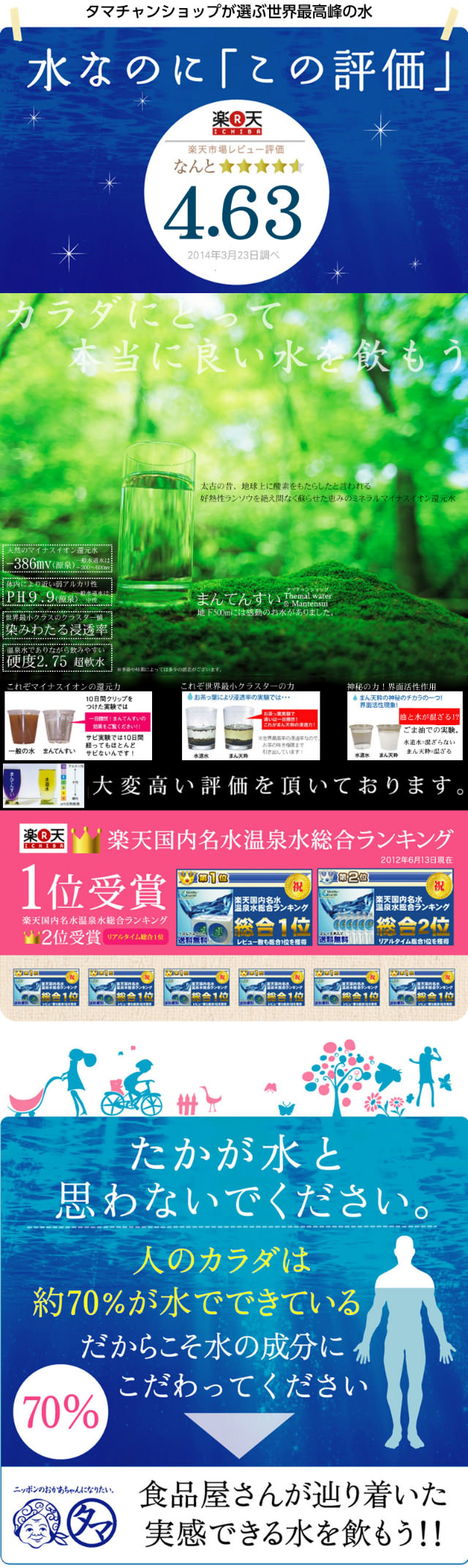 桜島の活火山が育んだ感動の温泉水「まん天粋」 活火山の地下に眠る1万年前の伏流水だから、ミネラル、PH値、浸透率、還元力が違う! 私たちの体は、約70%が水でできており、体内の水分がキレイでないと、病気や老化に影響をもたらします。健康・美容ダイエットも一番大切なのは良い水を飲むこと。体内細胞に関わる飲料水にこだわる事が、すべての健康・美容など体質改善の基本になります。いつもの飲料水を、まん天粋に変えてみませんか? 桜島の活火山が育んだ感動の温泉水「まん天粋」