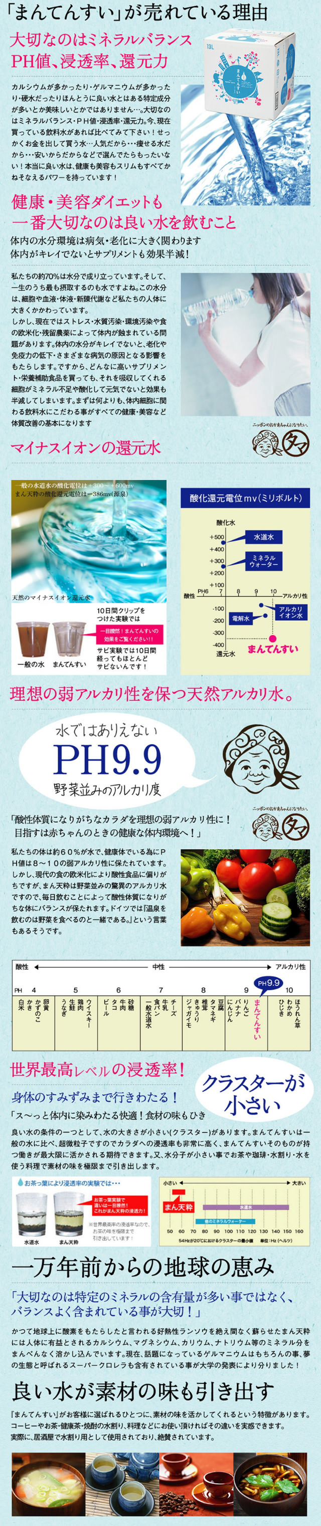 まん天粋は、活火山である桜島の地下に眠る1万年前の伏流水だから、天然のマイナスイオン還元水であり、野菜並みのpH値を誇ります。またミネラルバランスに優れており、浸透率も最高レベルです。