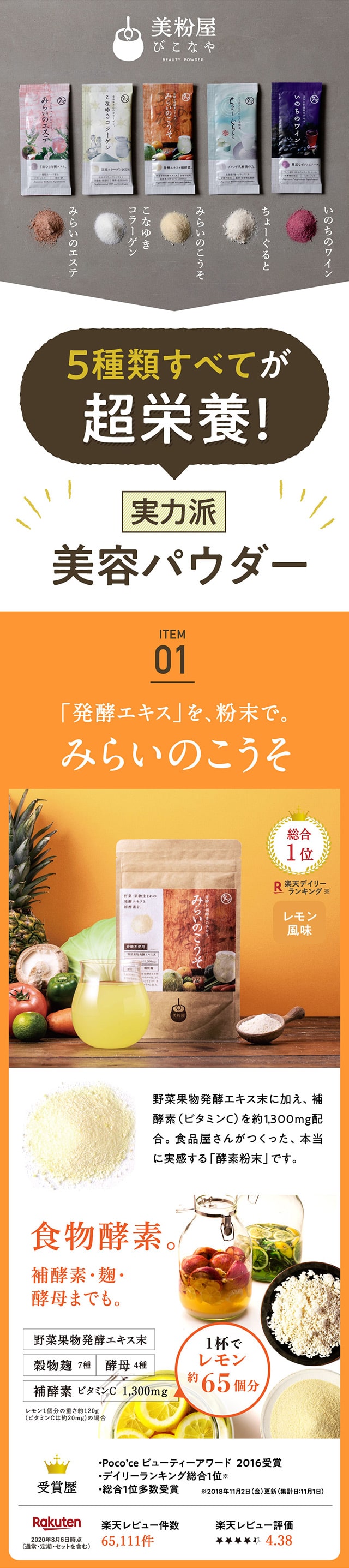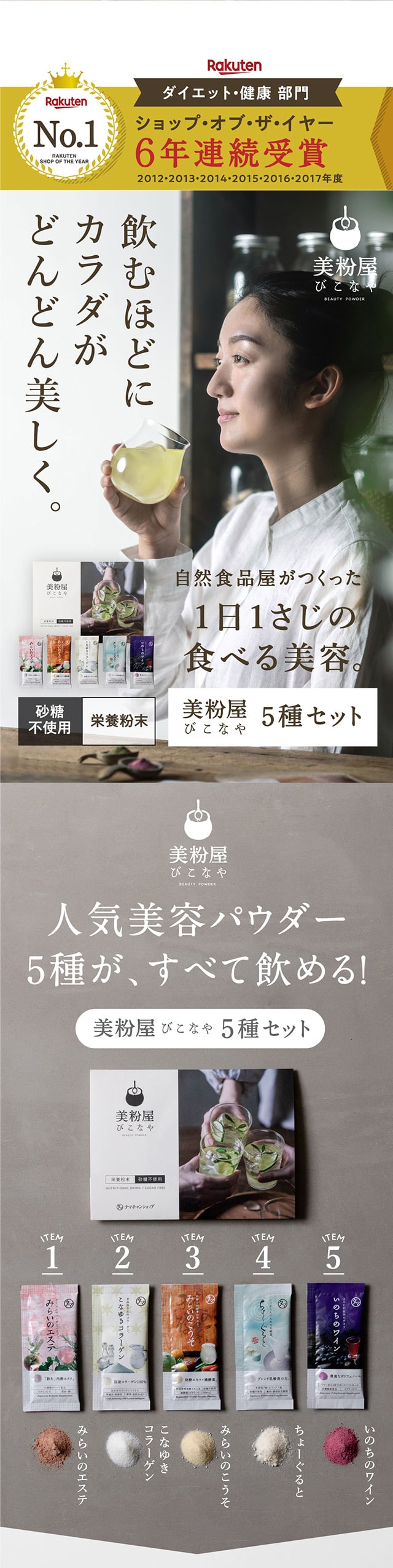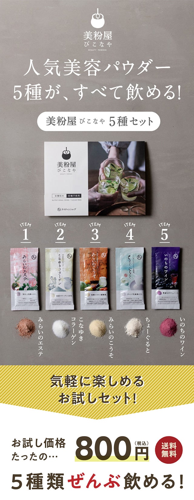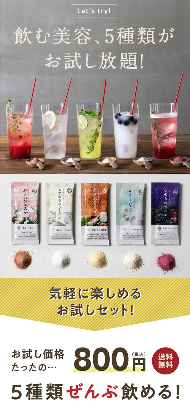 1日1さじの食べる美容、美粉屋分包5種類がセットに! 酵素+補酵素のチカラが詰まった「みらいのこうそ」、国産豚皮を使用した高品質・低分子コラーゲン「こなゆきコラーゲン」、動物性+植物性のW乳酸菌配合の「ちょーぐると」、ポリフェノールたっぷりの「いのちのワイン」、11種類のハーブが入ったクレンズドリンク 「みらいのエステ」、この5種類がお試いただけます。