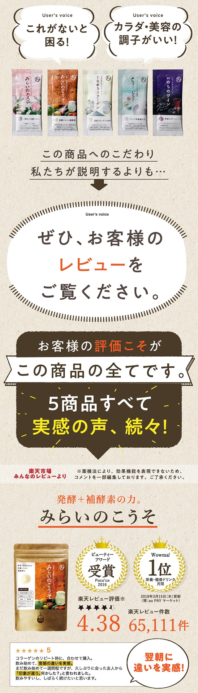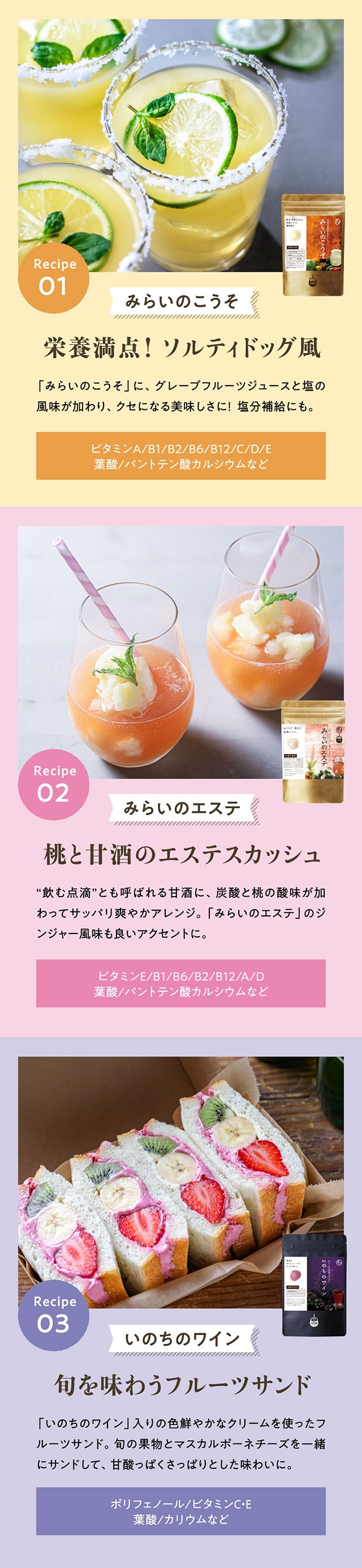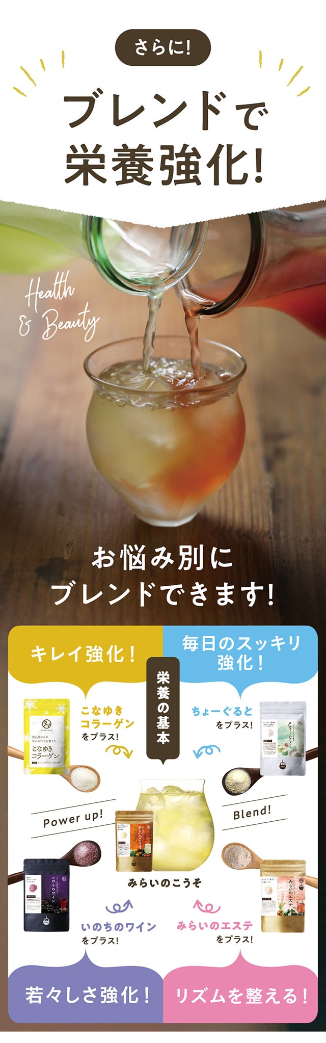 1日1さじの食べる美容、美粉屋分包5種類がセットに! 酵素+補酵素のチカラが詰まった「みらいのこうそ」、国産豚皮を使用した高品質・低分子コラーゲン「こなゆきコラーゲン」、動物性+植物性のW乳酸菌配合の「ちょーぐると」、ポリフェノールたっぷりの「いのちのワイン」、11種類のハーブが入ったクレンズドリンク 「みらいのエステ」、この5種類がお試いただけます。