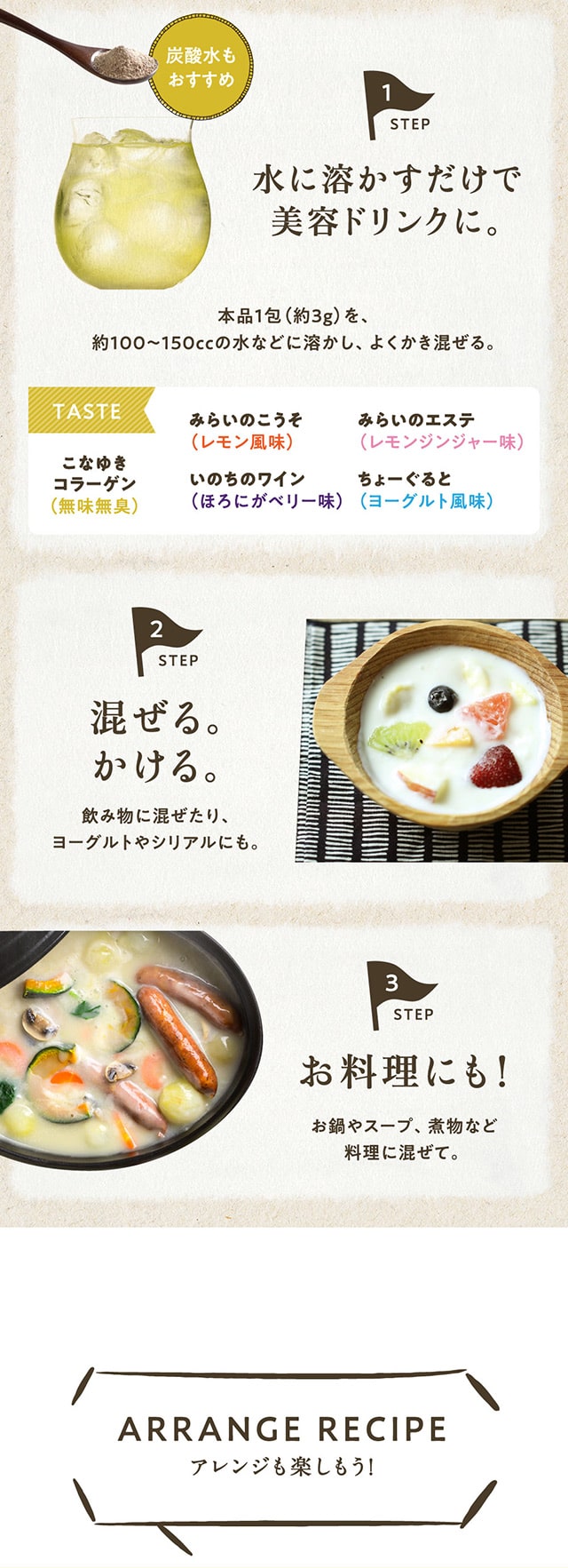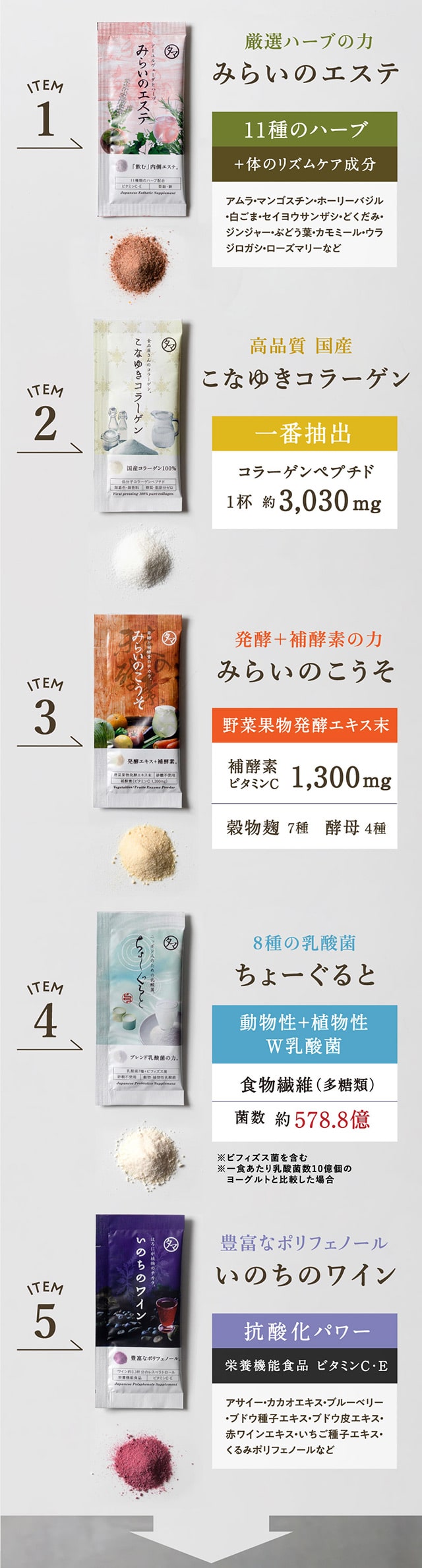 [内容量]みらいのこうそ3g×1包、ちょーぐると3g×1包、こなゆきコラーゲン3g×1包、いのちのワイン3g×1包、みらいのエステ3g×1包