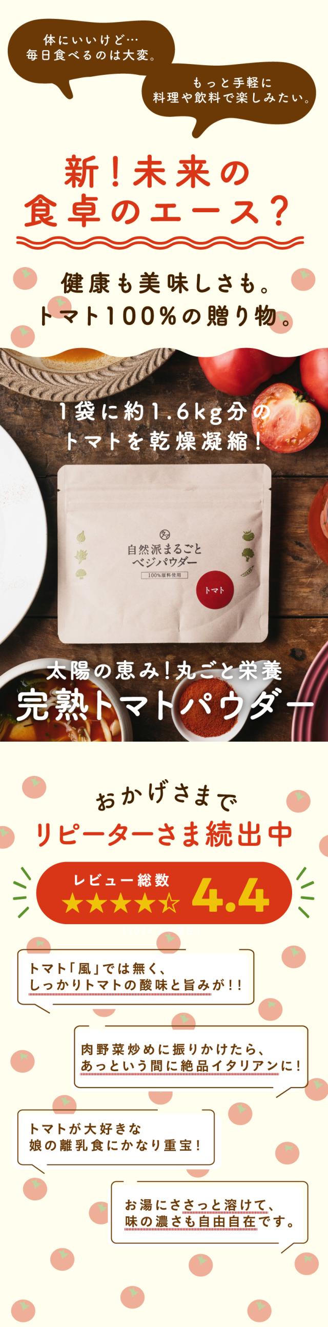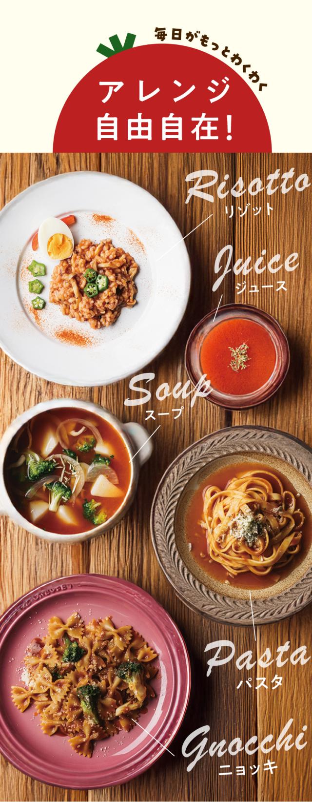 いつでも、サッと使えるフレッシュな完熟トマトパウダーで、毎日よ料理や飲料に手軽にお使いいただけます。