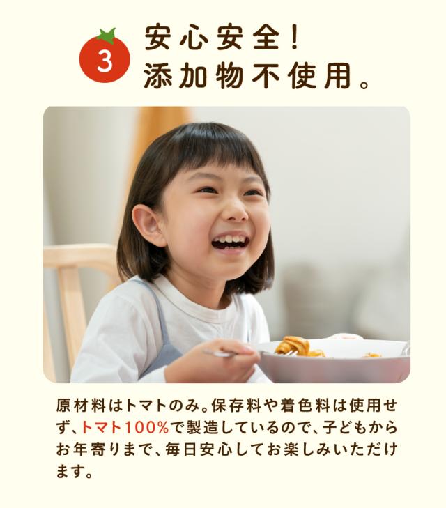 甘味・酸味・旨味のバランスがよく、保存料や着色料を使用せず、トマト100%で製造しています。