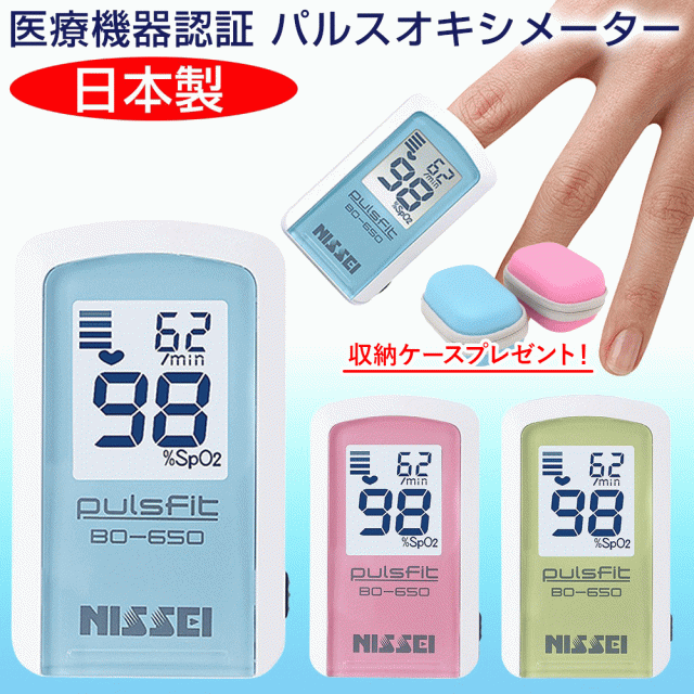【オリジナル収納ケース付】日本製 医療機器認証 パルスオキシメーター NISSEI 日本精密測器 パルスフィット BO-650 反転表示付き 脈拍 測定 血中酸素濃度計 小児〜大人まで 医療用 家庭用 パルスオキシメータ 測定器 選べる3色 簡単操作